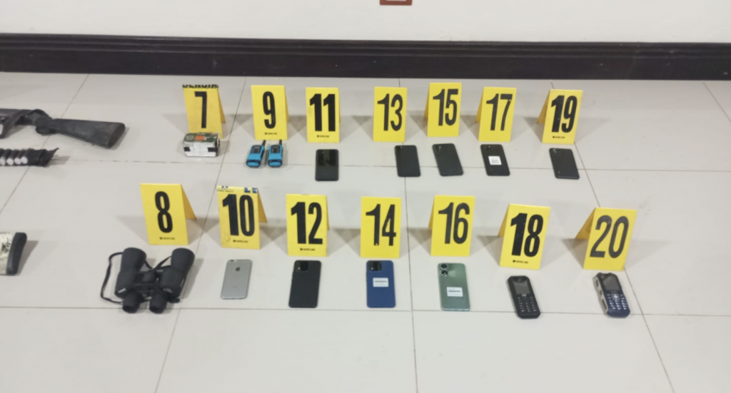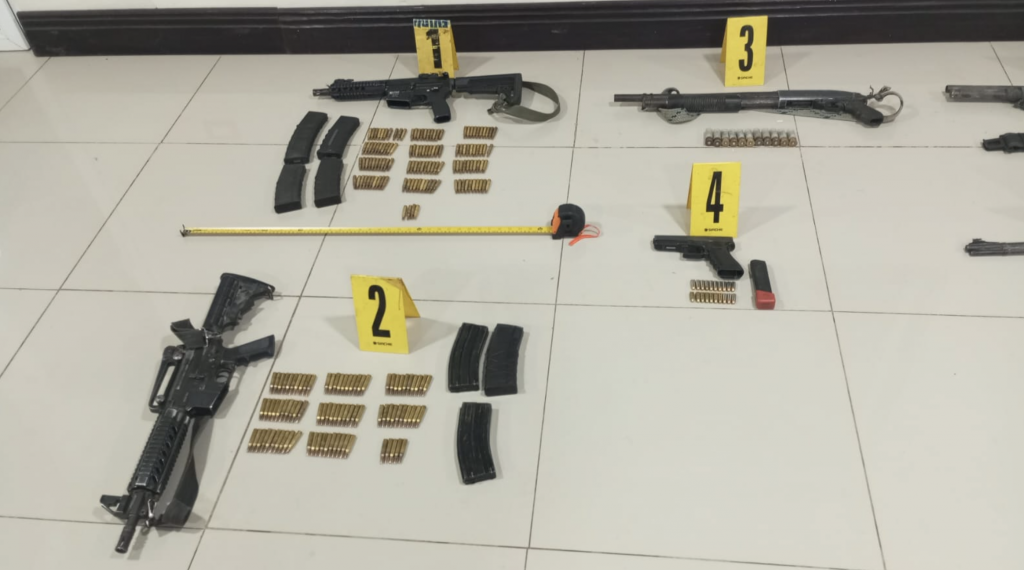 Según detallaron las autoridades indicaron que los aprehendidos les decomisaron una pistola 9 milímetros marca Glock, un rifle calibre .22, dos carabinas calibre .223 (Rem y Utas), 2 escopetas calibre 12, 8 tolvas, 216 municiones de distintos calibres. También 2 radiocomunicadores y el picop Ford con placas P-785FRX.