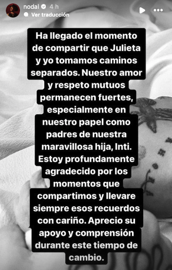 “Ha llegado el momento de compartir que Julieta y yo tomamos caminos separados. Nuestro amor y respeto mutuos permanecen fuertes, especialmente en nuestro papel como padres de nuestra maravillosa hija, Inti. Estoy profundamente agradecido por los momentos que compartimos y llevaré siempre esos recuerdos con cariño. Aprecio su apoyo y comprensión durante este tiempo de cambio”, escribió Nodal en su cuenta de Instagram.
