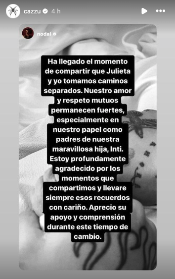 El intérprete de música regional mexicana, Christian Nodal, expresó en su publicación que tanto él como Cazzu han decidido tomar caminos separados, aunque mantienen un profundo respeto y amor mutuo, especialmente en su rol como padres de su hija Inti. Nodal agradeció los momentos compartidos y aseguró que siempre llevará esos recuerdos con cariño.