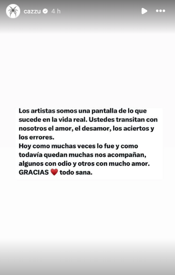 “Los artistas somos una pantalla de lo que sucede en la vida real. Ustedes transitan con nosotros el amor, el desamor, los aciertos y los errores. (…) Gracias. Todo sana”, señaló la cantante de música urbana.