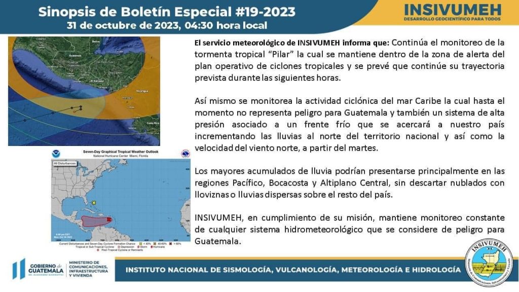 El acercamiento de la tormenta tropical Pilar a Guatemala provocará abundante nubosidad y lluvias en el territorio nacional según anunció esta mañana de martes 31 de octubre el Insivumeh.