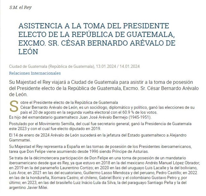 La casa real de España, confirma el viaje a Guatemala de su majestad el ReyFelipe VI, quien participará en la toma de posesión del Presidente Electo Bernardo Arevalo.
