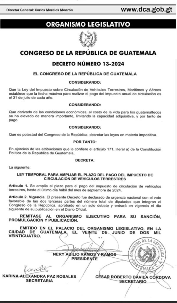 En una medida destinada a aliviar la carga financiera de los ciudadanos, el Gobierno de Guatemala ha publicado en el Diario Oficial el Decreto 13-2024, el cual extiende el plazo para el pago del impuesto de circulación por dos meses adicionales. Esta extensión permitirá a los propietarios de vehículos más tiempo para cumplir con sus obligaciones fiscales sin incurrir en multas por pagos tardíos.