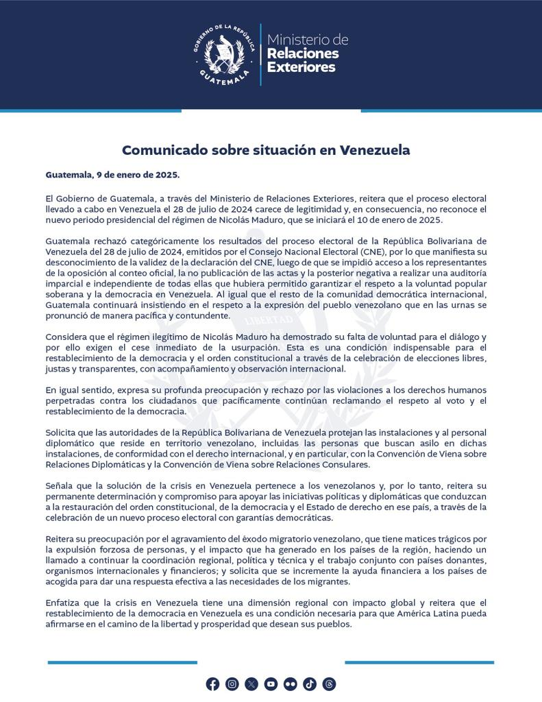 La Cancillería aseguró que Guatemala seguirá exigiendo el respeto a la voluntad del pueblo venezolano y la realización de elecciones libres, justas y transparentes. Además, señaló que el cese inmediato de la usurpación es esencial para el restablecimiento de la democracia en Venezuela.