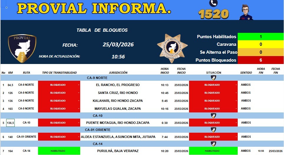 De acuerdo con el reporte más reciente de Provial, actualizado a las 10:56 horas de este miércoles 25 de marzo, se contabilizan al menos seis puntos bloqueados en diferentes departamentos, afectando el paso en ambos sentidos.