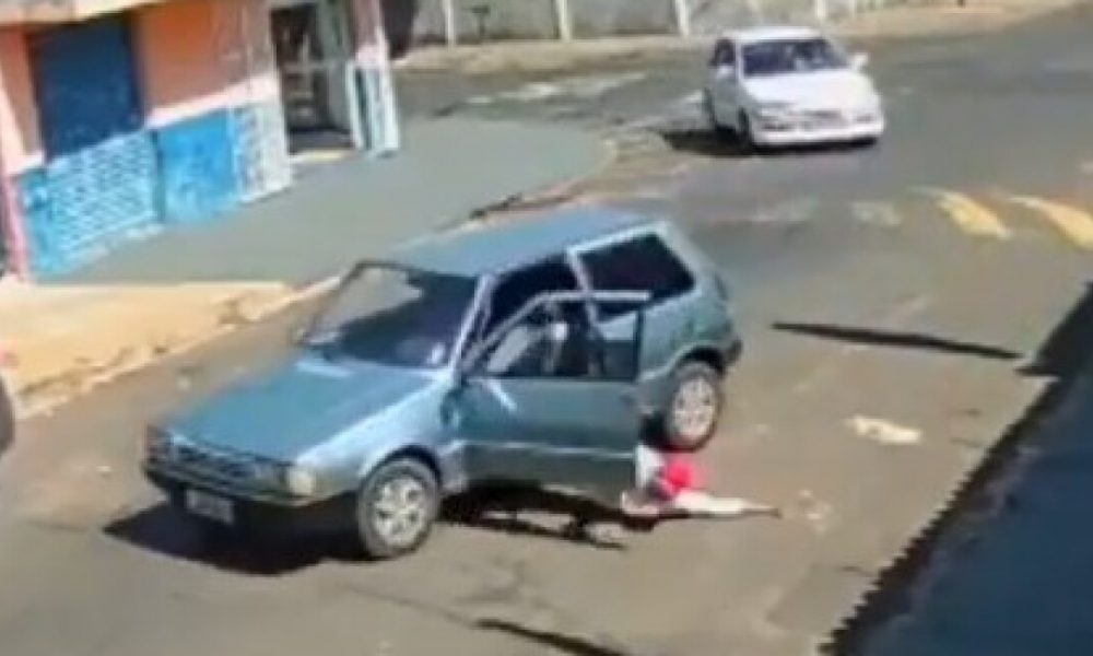 Imágenes de cámaras de seguridad muestran el momento en que un conductor cae de su propio auto en movimiento.