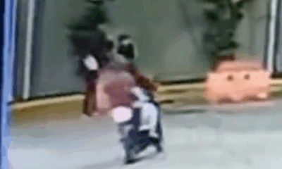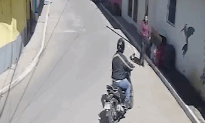 Una cámara de vigilancia grabó el momento en que un hombre que se conducía en motocicleta comete un robo en contra de una mujer que caminaba...